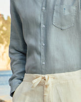 Realizzata in lino morbido e traspirante, è arricchita da bottoni incisi e dal ricamo della palma, simbolo distintivo del brand.