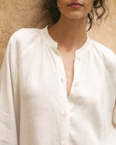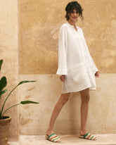 L'abito Santa Cruz presenta un design corto e svasato, realizzato in finissimo lino bianco.