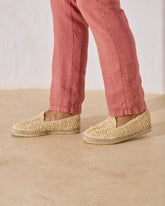 The lightweight raffia upper provides a breathable, textured aesthetic, while the traditional jute sole ensures flexibility and comfort.