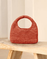 Handmade from premium raffia material in Madagascar, this halfmoon-shaped handbag boasts a cool, unique design.