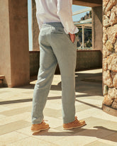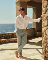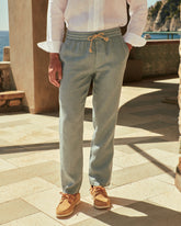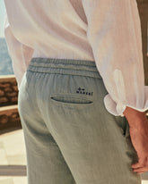 Made in Italy from washed linen, they feature an elastic waistband, functional pockets, and a refined embroidered logo.